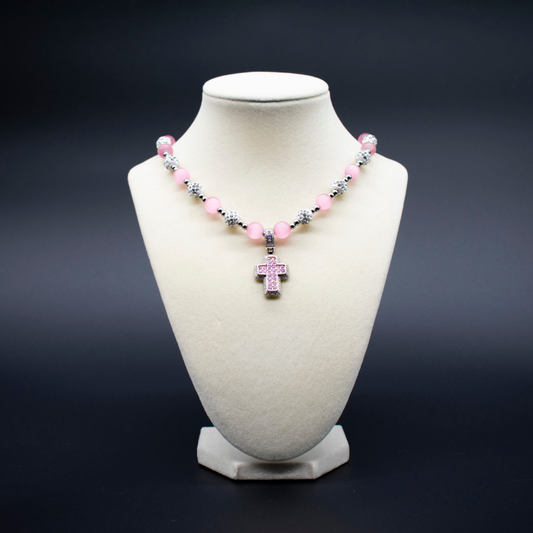 Pink Cat's Eye Bling Pink Cross Beaded Necklace