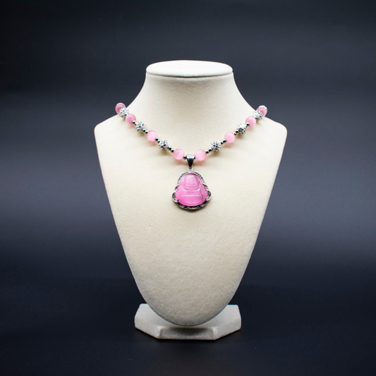Pink Cat’s Eye Bling Laughing Buddha Beaded Necklace